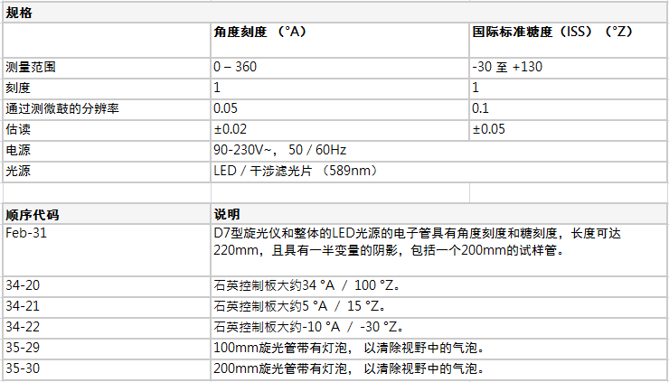 D7型旋光儀的電子管具有角度刻度和(國際標準糖度)(ISS)糖刻度,長度可達220毫米,測微鼓可以進行精確讀數,并提供一個200毫米樣品管。 刻度范圍:0至360°A和-30°Z至+130°Z,精度優于±0.05°A和±0.1°Z。