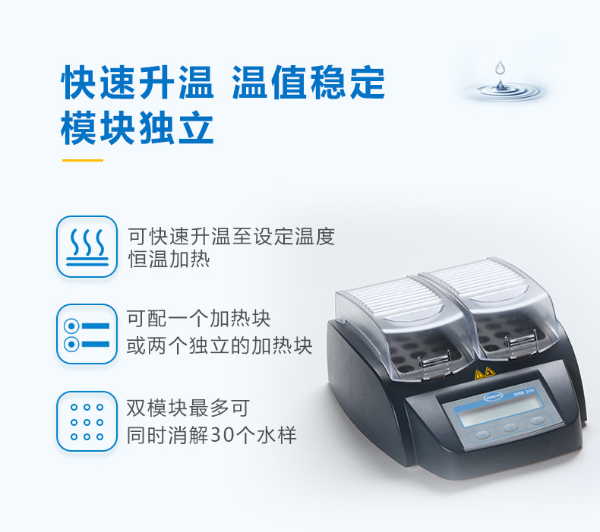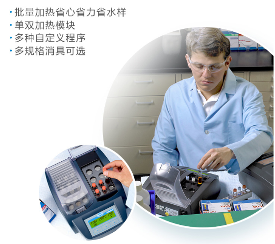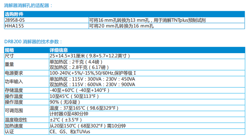 DRB200消解器是哈希公司開發的消解裝置,可進行COD、TOC、總磷、總氮等水樣的消解。消解時間及消解溫度可分別在37-165℃、0-480分鐘的范圍內選擇。根據用戶的需求,可在DRB200消解器中配置一個加熱塊或兩個獨立的加熱塊,加熱塊中的消具有3種尺寸規格,分別是適用于帶條形碼的TNTplus預制試劑(13mm),適用于普通的TNT預裝管(16mm),適用于金屬消解預處理的預裝管(20mm)