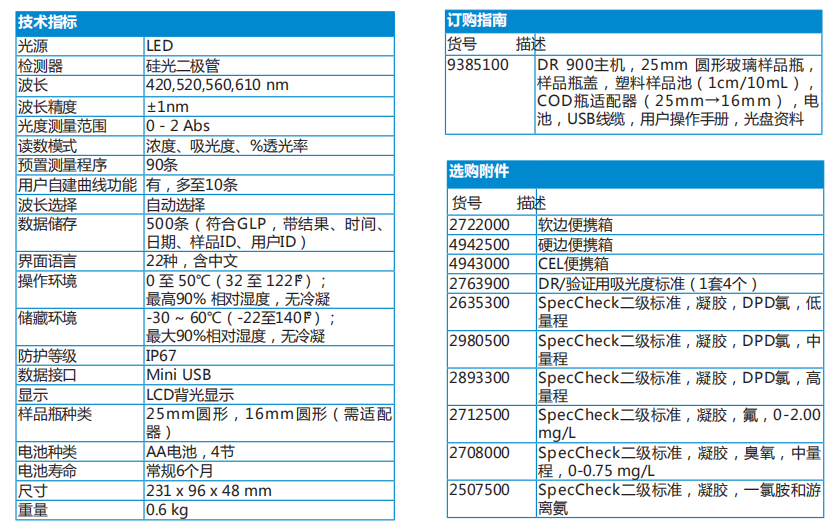 DR900具有自動波長選擇和自動波長校正功能,儲存有90條標準曲線,可測量多個參數,大屏幕直接顯示測量結果。使用粉枕、安瓿瓶試劑、預裝管(TNT管)等
