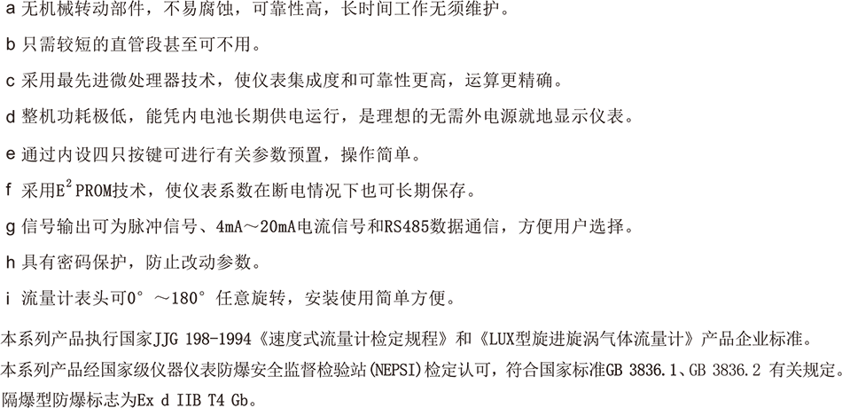 LUX型旋進旋渦氣體流量計集旋進流量傳感器和流量積算儀于一體,可測量氣體工況流量和總量,該產品差動式雙壓電傳感器技術,具有準確度高、穩定性好、抗干擾能力強、無旋轉可動部件、維護簡單方便等特點,可應用于石油、化工、電力、冶金等工業行業的氣體流量及體積計量和檢測。