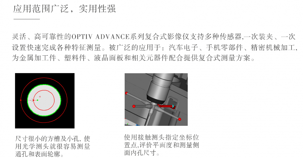 得益于其所配置的高端的中央處理器,靈活、高可靠性的OPTIV ADVANCE系列復合式影像儀支持多種傳感器,被廣泛的應用于3C電子和汽車行業。為金屬加工件、塑料件、液晶面板和相關元器件配合提供復合式測量方案。